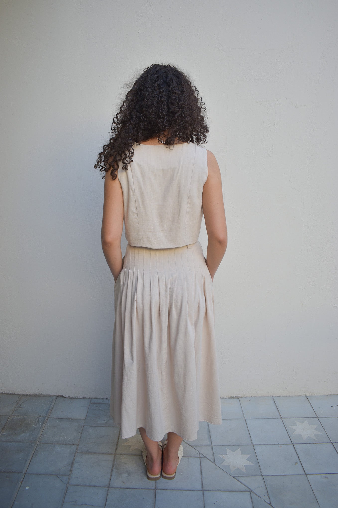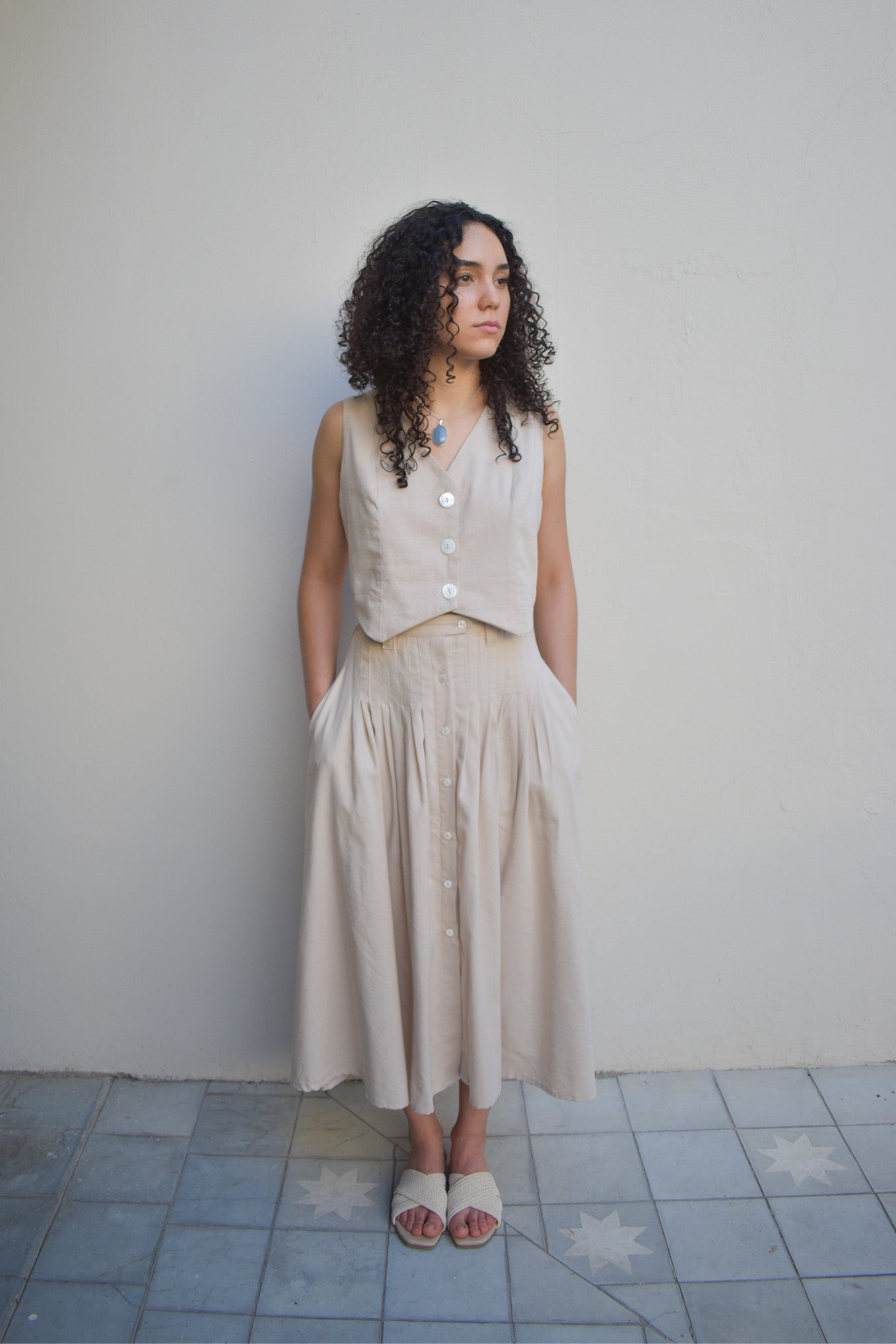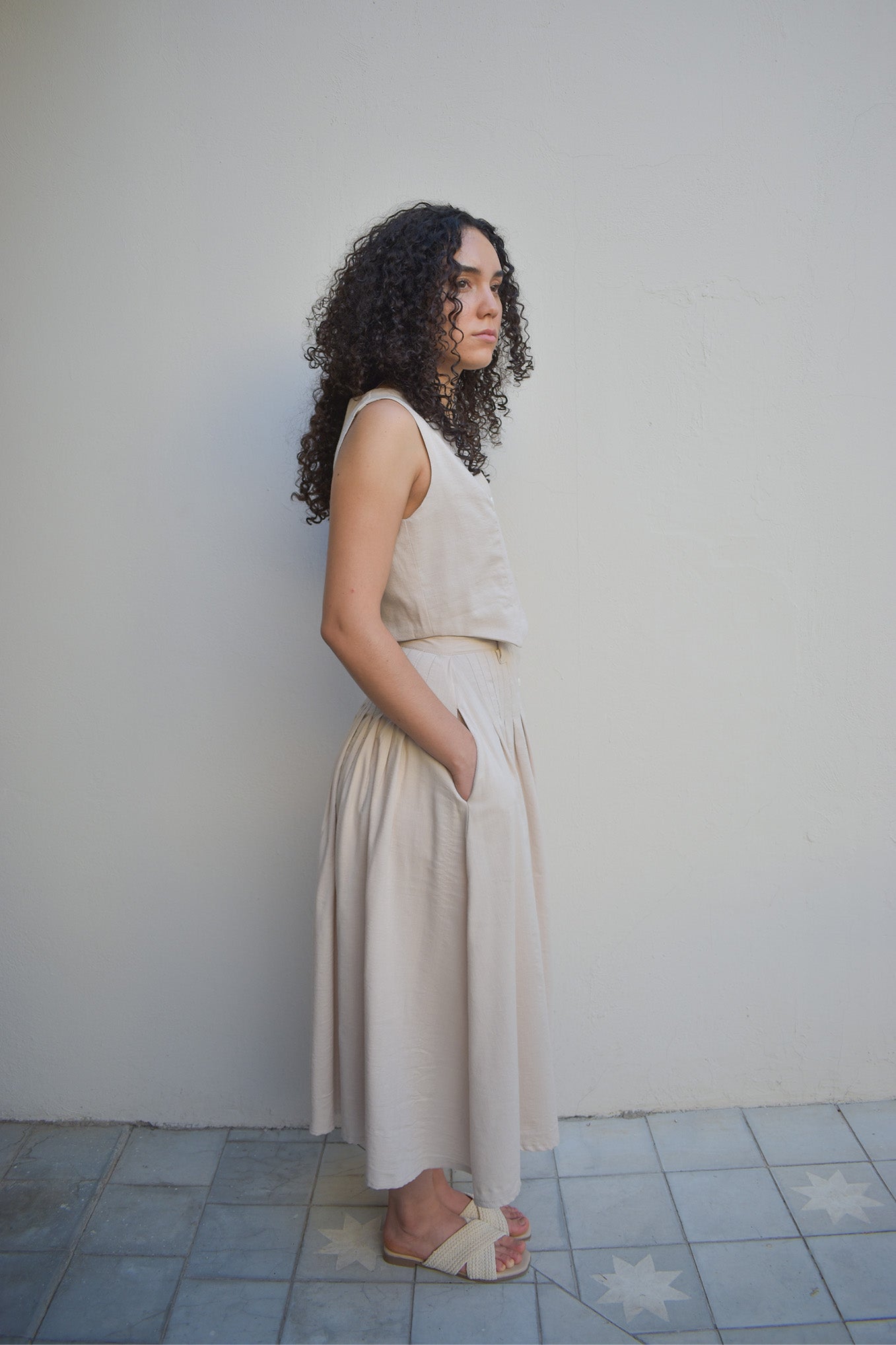 Falda Hereditas de significado herencia. Una prenda confeccionada en lino bambú de textura suave y fresca. Con un color neutral y básico podrás usarla de muchas maneras en cualquier época poca del año. Además, cuenta con dos prácticos bolsillos laterales. Este producto es elaborado a mano en México y es sobre pedido. La duración aproximada de elaboración es de 6 a 8 días hábiles. Somos una marca de moda lenta, y sostenible.