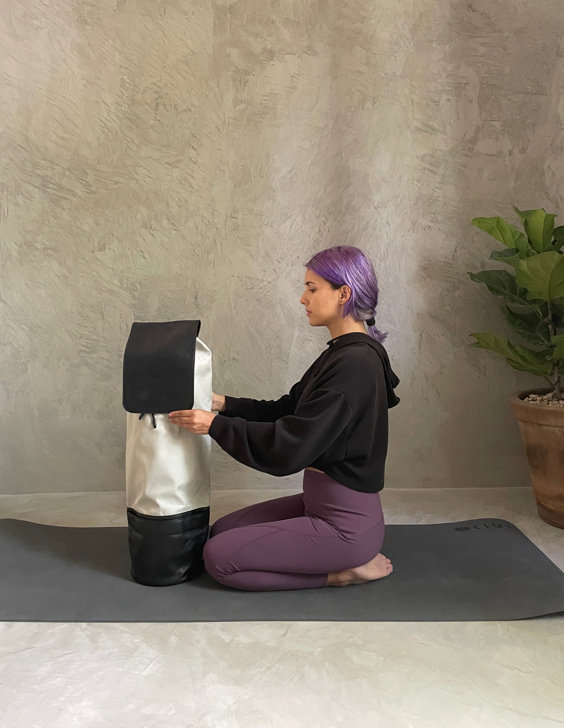 Descubre la Mochila Akam, cuyo nombre significa 'Pie'. Este accesorio es sumamente práctico para transportar tu tapete de yoga, cartera, llaves y más, todo en un solo lugar, sin la necesidad de cargar otra bolsa y permitiéndote dirigirte cómodamente a tu clase de yoga.